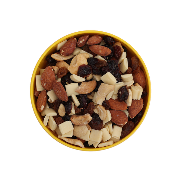 A warm blend of dry-roasted almonds, lightly salted cashew pieces, juicy raisins, and fruit-juice infused cranberries,with certified-organic white chocolate.Scored Product Attributes