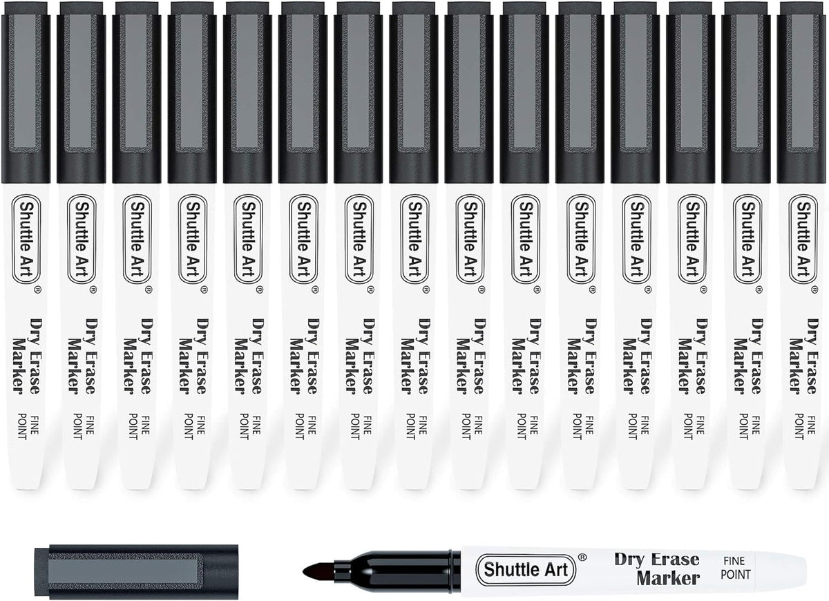 Shuttle Art 15 pack black magnetic dry erase markers ,all with black ink. Magnetic marker caps feature built-in felt erasers. With magnetic markers on caps, you can stick it on the magnetic surface where you just need to take it down and write. Moreover,You’ll never lose a dry erase marker again. The Eraser tips on eacScored Product Attributes